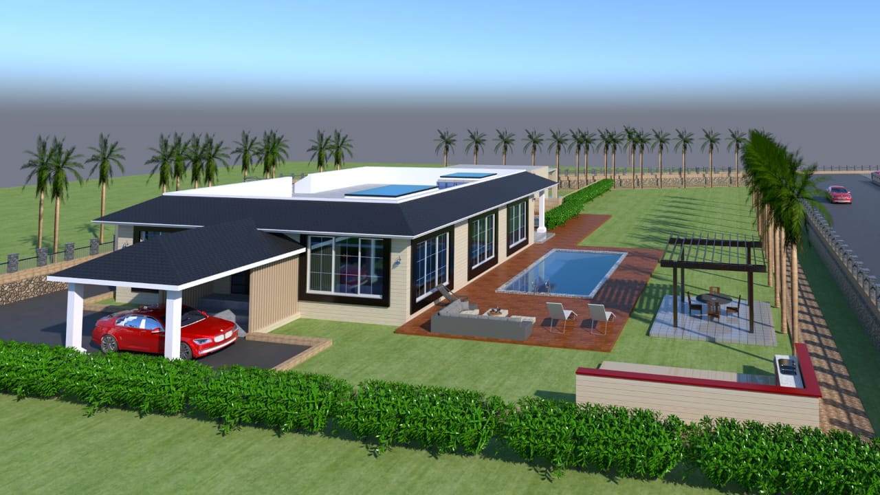 Farmhouse No.57 is a residential project situated on an uneven and sloping terrain. The project consists of a main single-storey building and an additional double-storey servant quarter. The client enlisted the expertise of the Prime Design Consultant to undertake the architectural planning and to create a realistic 3D representation of the project.