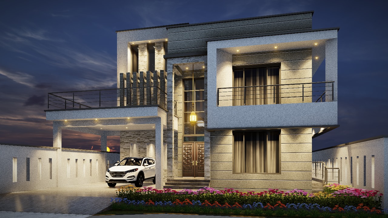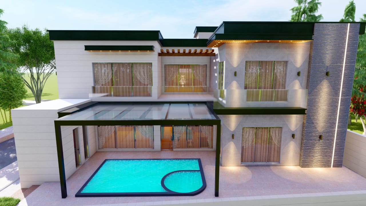The subsequent stages of the project involved meticulous attention to the Mechanical, Electrical, and Plumbing aspects. In adherence to local building regulations, the design encompassed the installation of rainwater harvesting tanks and concealed underground water reservoirs, serving both sustainable water practices and regulatory compliance. Additionally, an enticing swimming pool was seamlessly integrated on the right side of the main building, enhancing the overall appeal and functionality of the property.